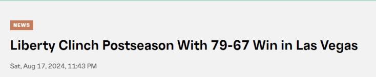 08月18日讯 WNBA常规赛,纽约自由人以79-67击败拉斯维加斯王牌,连续第二场战胜卫冕冠军。最近10场比赛,自由人拿下9胜1负的傲人战绩。
